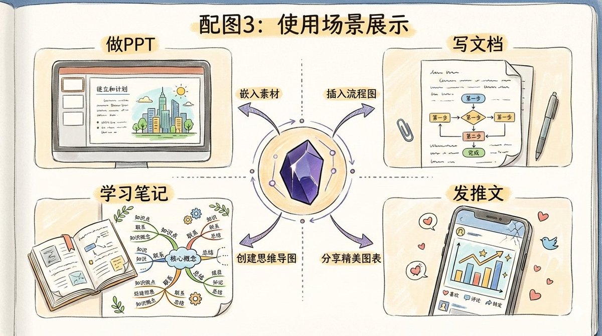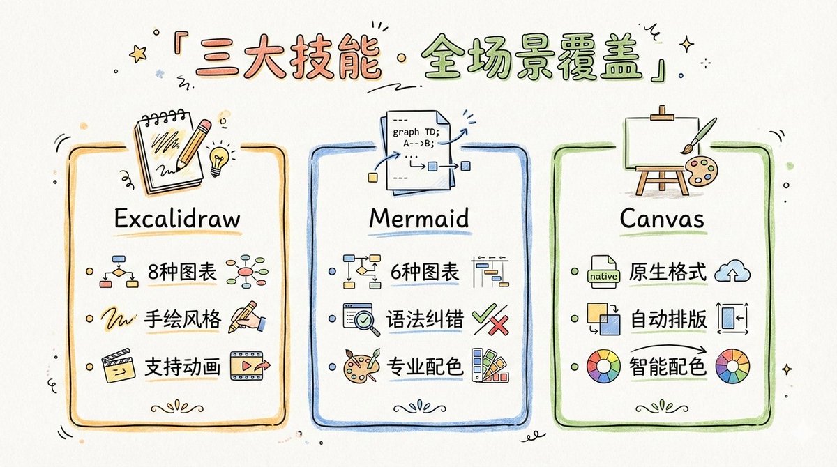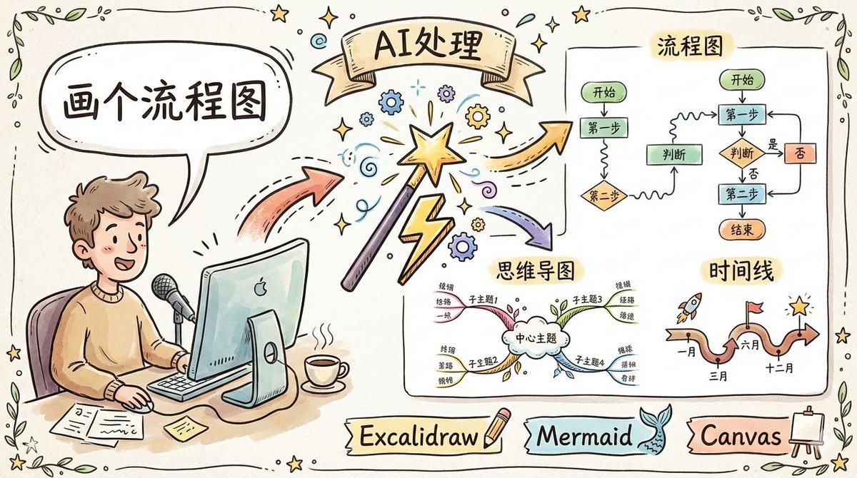 Excalidraw Diagram Generator This is my favorite!!! The generated diagrams are all in hand-drawn style, with 8 chart types to choose from: flowcharts, mind maps, hierarchical charts, relationship diagrams, comparison charts, timelines, matrix charts, freeform layouts. It even supports Chinese! And it can do animations!!!