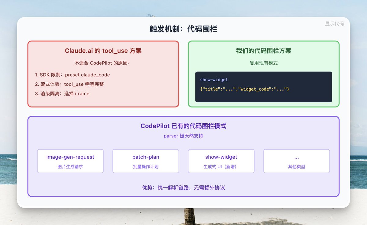 tool_usemust wait forinput_json_deltato be fully assembled before rendering, and doesn't support incremental HTML rendering. With the code fence method, HTML arrives with the text stream, allowing preview as it generates. - Rendering Isolation. Claude.ai uses Shadow DOM for isolation. We chose a sandboxed iframe. Iframe isolation is more thorough—a completely independent JS execution environment, with CSP precisely controlling resource loading, eliminating style leakage and script escape.