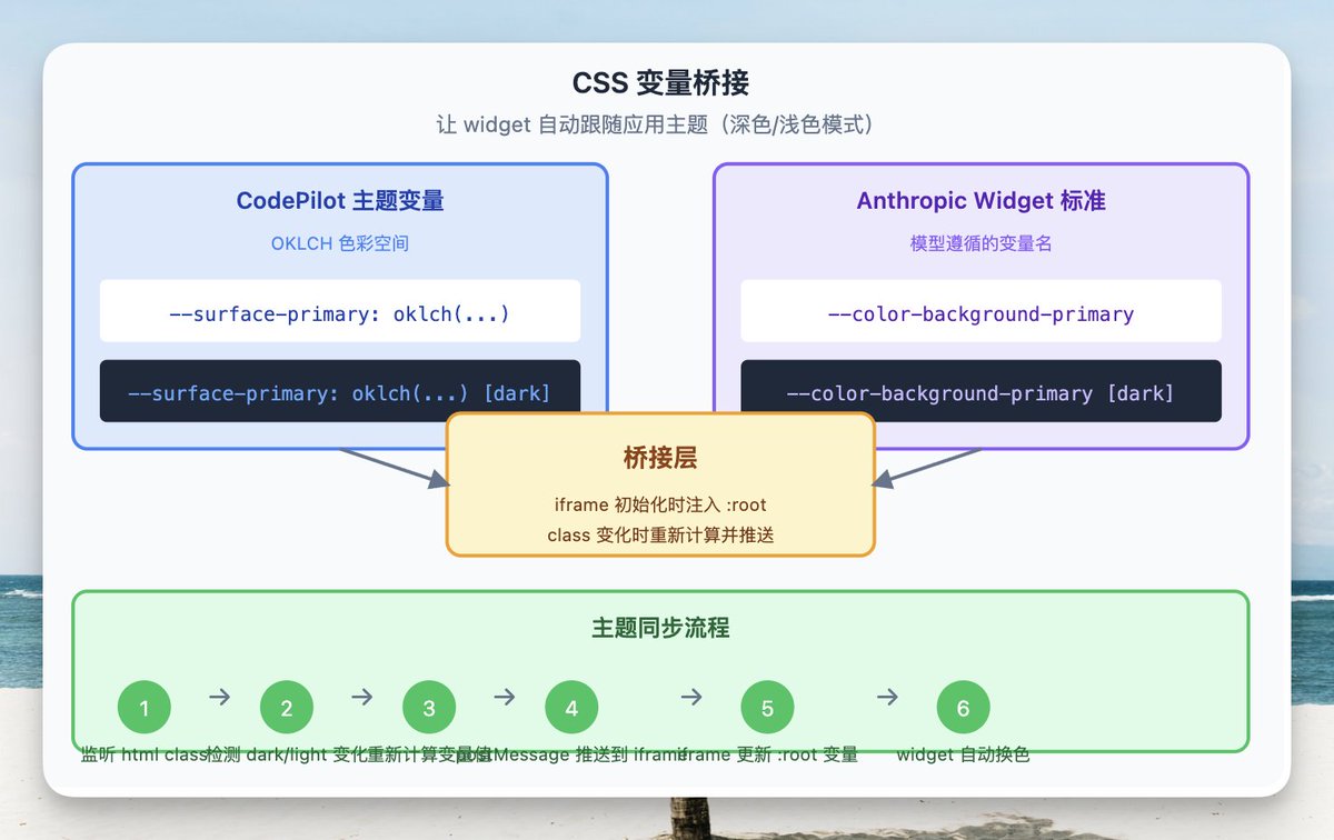 --color-background-primary.The bridging layer injects CodePilot's variable values into the iframe's
