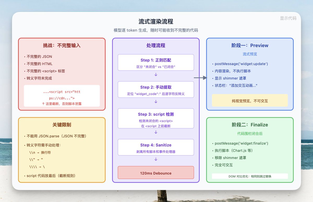 postMessage. During the streaming preview phase, widget:update is sent without executing scripts. For final rendering, widget:finalize is sent to execute scripts.A