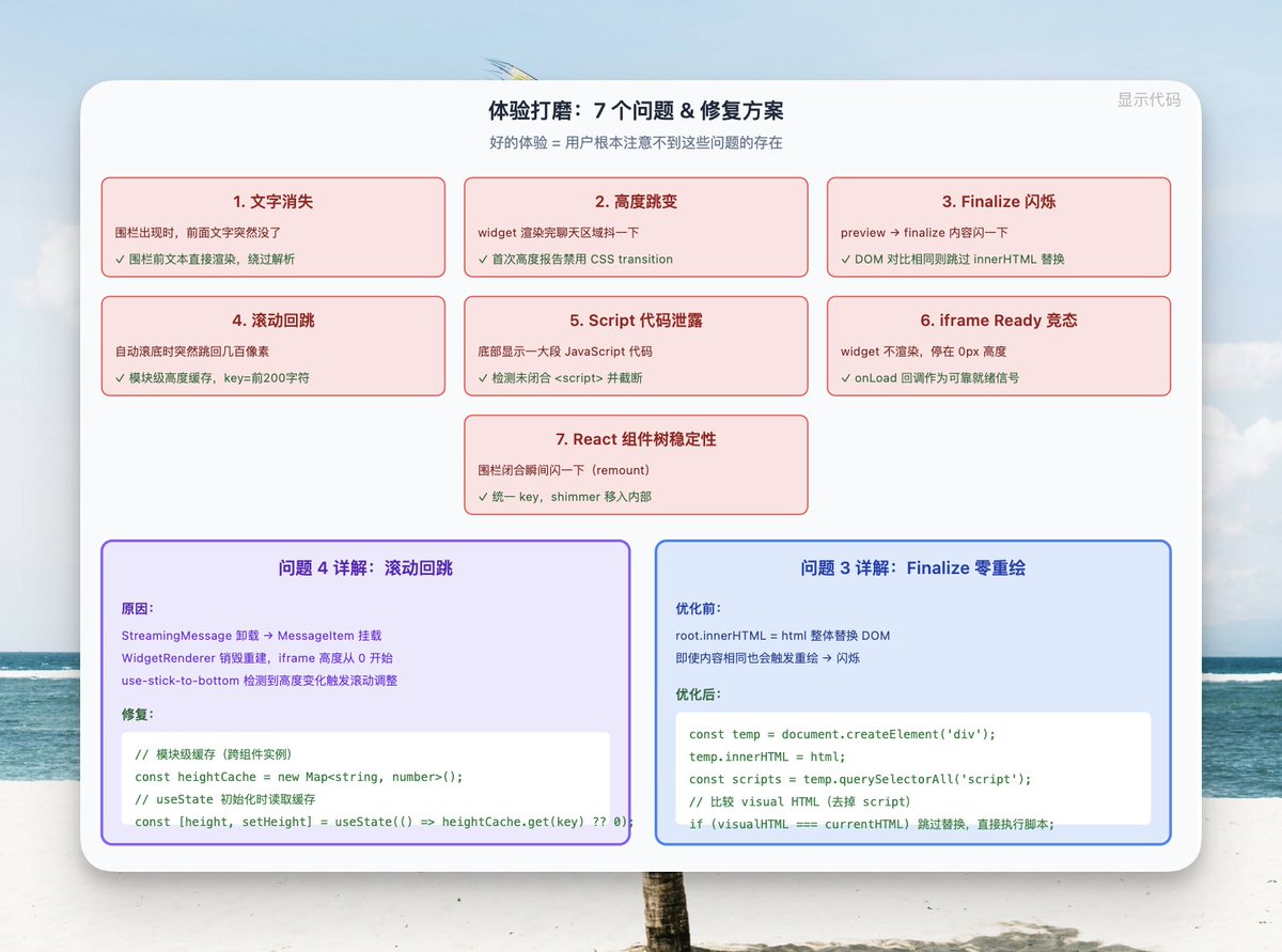 StreamingMessage component unmounts and the MessageItem component mounts. These are two completely different React components, and the internal WidgetRenderer is destroyed and recreated. The new instance's iframe height starts from 0, causing the content area height to plummet. use-stick-to-bottom detects the height change and triggers a scroll adjustment.Fix: Module-level height cache. Whenever a widget reports its height, write it to the cache using the first 200 characters of