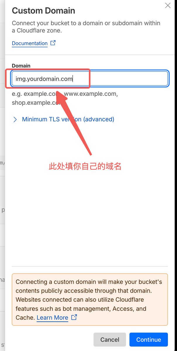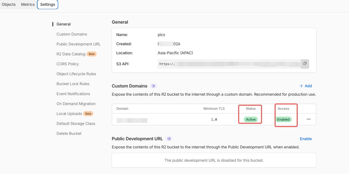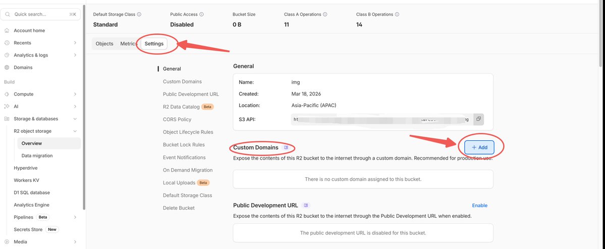 If your domain is already managed by Cloudflare (or accessed via CNAME), binding a custom domain is very simple: Go to Bucket → Settings → Custom Domains → Connect Domain, enter the subdomain you want to use (e.g., img.yourdomain.com). Cloudflare will automatically add the DNS record and issue an SSL certificate.