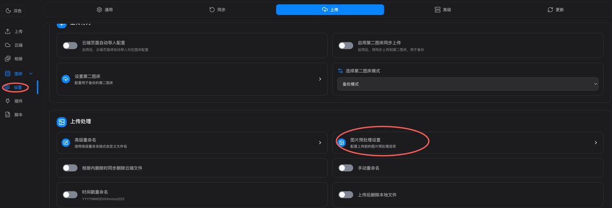 PicList has built-in format conversion before upload. Go to PicList Settings → Upload Processing → Image Preprocessing Settings → Image Format Selection → Target WebP. Enable this, and all images will be automatically converted to WebP format before upload. In practice, a 500 KB PNG screenshot is typically reduced to around 100–150 KB after conversion, a reduction of about 70%.