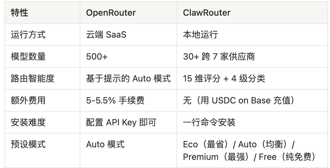 ClawRouter is an Agent-native router developed by BlockRunAI specifically for the OpenClaw ecosystem, going further than OpenRouter—it runs locally on your machine, <1 ms latency, scores each request on 15 dimensions, automatically routes to the cheapest and capable model.