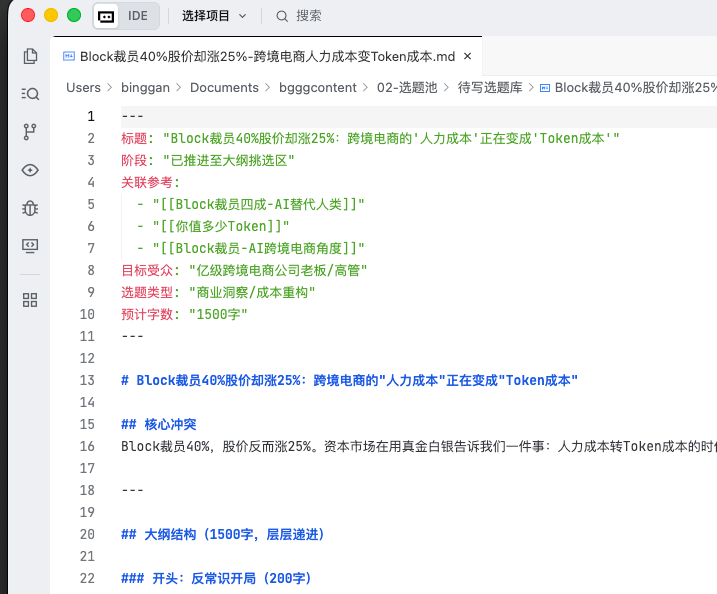 待写选题库for the user to choose. After selection, you must first search the inspiration library, combine reference materials to generate 3 different angle outlines, and store them inbgggcontent/03-内容工厂/1-大纲挑选区/waiting for user confirmation. Strictly prohibit generating outlines without prior retrieval.