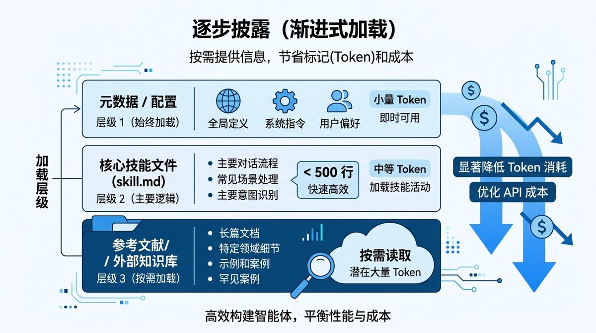做法是分三层:元数据层永远加载(名字、描述、触发词),skill.md 主体控制在500行以内,详细的参考资料放到 references/ 目录下按需加载。这样 Agent 平时只消耗很少的 token,需要深入某个领域的时候再加载对应的参考文档