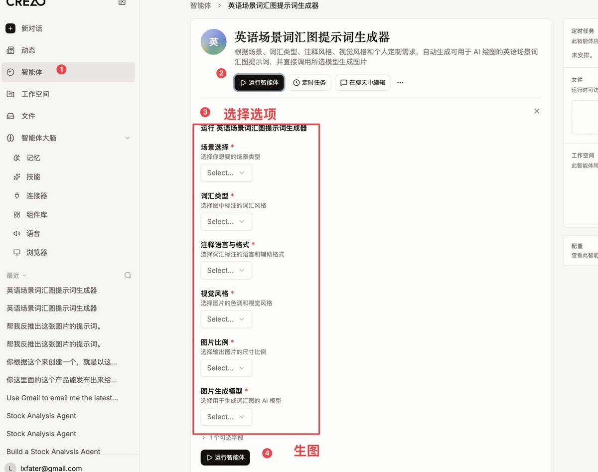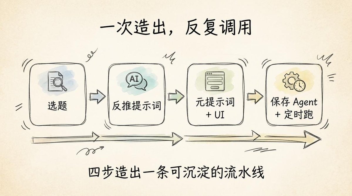 做调研(小红书挖痛点)→ 反推 Prompt→ Meta Prompt + UI(定制化)→ 保存 Agent + Scheduled Run(自动化)
