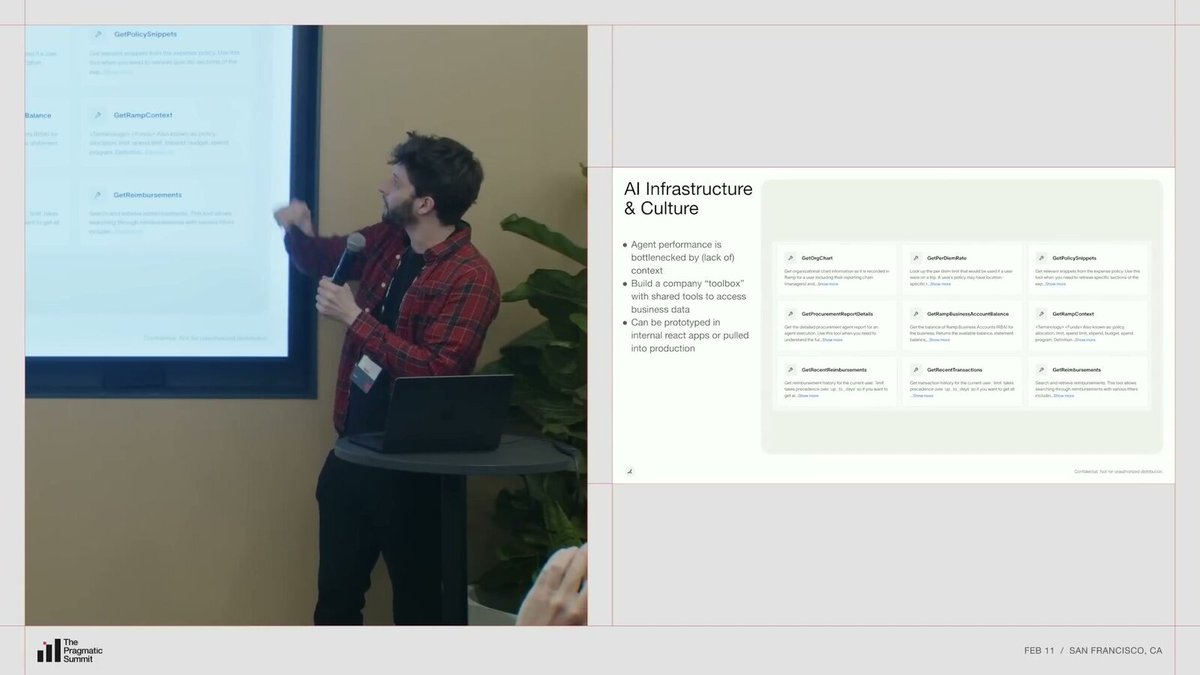 在工具层面,Ramp 建了一个内部工具目录。里面有像“获取政策片段”“查 PDM 费率”“查最近交易”这样的工具,由产品团队参与建设,深入理解数据和场景的细微之处。这个目录当前已有数百个工具,预期会增长到数千个。