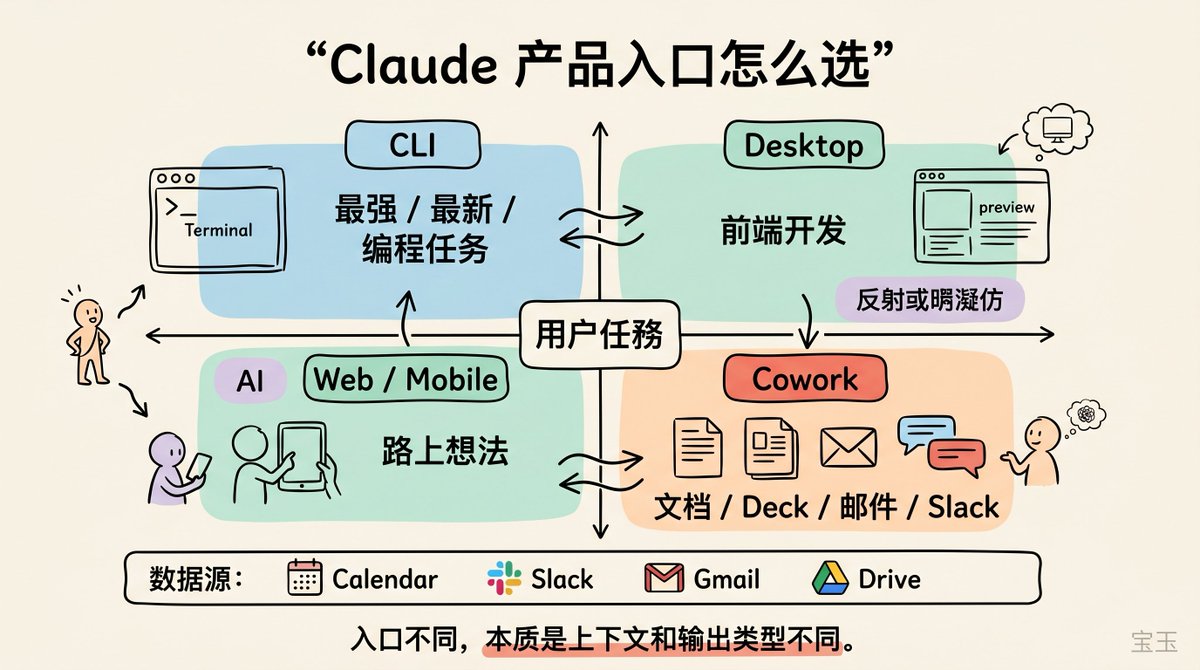 - 什么时候用 Claude Code 什么时候用 Cowork? 需要代码输出用 Claude Code,需要非代码输出(文档、deck、邮件处理)用 Cowork。