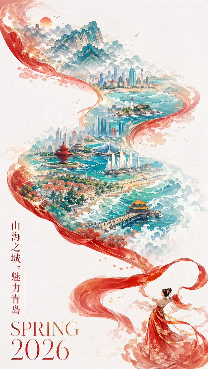 一张充满新春喜庆氛围但不失高雅格调的 2026 城市宣传海报。双重曝光,构图延续 S 型的流动感;在纯白的纹理背景右下角,一个身穿中国传统服饰的微缩人物正在挥舞着一条长长的红色丝绸舞带,这条红绸在空中舞动,不仅展现出丝绸的柔顺质感,更在向左上方飘动的过程中,奇幻地变形成了一条壮丽的山海长卷。在这条"山海"中,叠加了一个有山有海的青岛城市手绘图,国潮,景色尽在眼底,壮阔雄伟,令人震撼。青岛的地标建筑(栈桥、五四广场、奥帆中心、小青岛灯塔、八大关红瓦建筑群、崂山)。海雾环绕,仙气缥缈,色彩丰富,结构复杂,细节丰富,但因为大面积留白,画面依然显得清新脱俗。左下角排版着"SPRING 2026"和竖排的宣传语,整体寓意"山海之城,魅力青岛"。文字排版优美大方,字迹清晰完整,尺寸 9:16。怎么改:把 青岛 替换为你的城市,地标部分换成本地的(北京→故宫/国贸/长城/胡同;成都→太古里/锦江/宽窄巷子/大熊猫;杭州→西湖/雷峰塔/钱塘江/灵隐寺;你家乡→你最想推的三四个点),宣传语一句也一并改。其余句式全部保留。