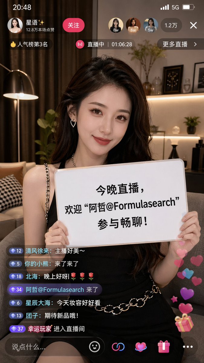 9:16 的图片比例,生成一张抖音直播的截图,里面是一位女网红在直播,手里拿着牌子,牌子里写着 今晚直播,欢迎”阿哲@Formulasearch