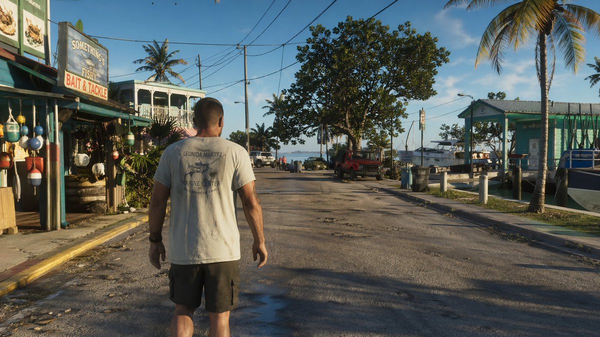 a screenshot from gta 6 with Jason walking in leonida keys就这一句。出来的画面带游戏 UI、光影、天气,看起来像官方泄露图。想换场景就改地点和动作:driving at night in Port Gellhorn、near the beach with Lucia。