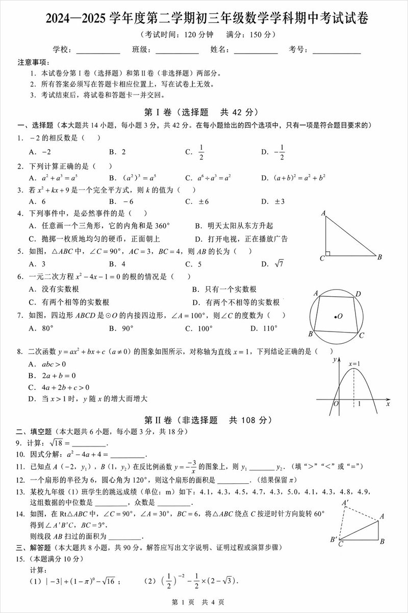 生成一张中文,初三年级的数学学科期中考试试卷